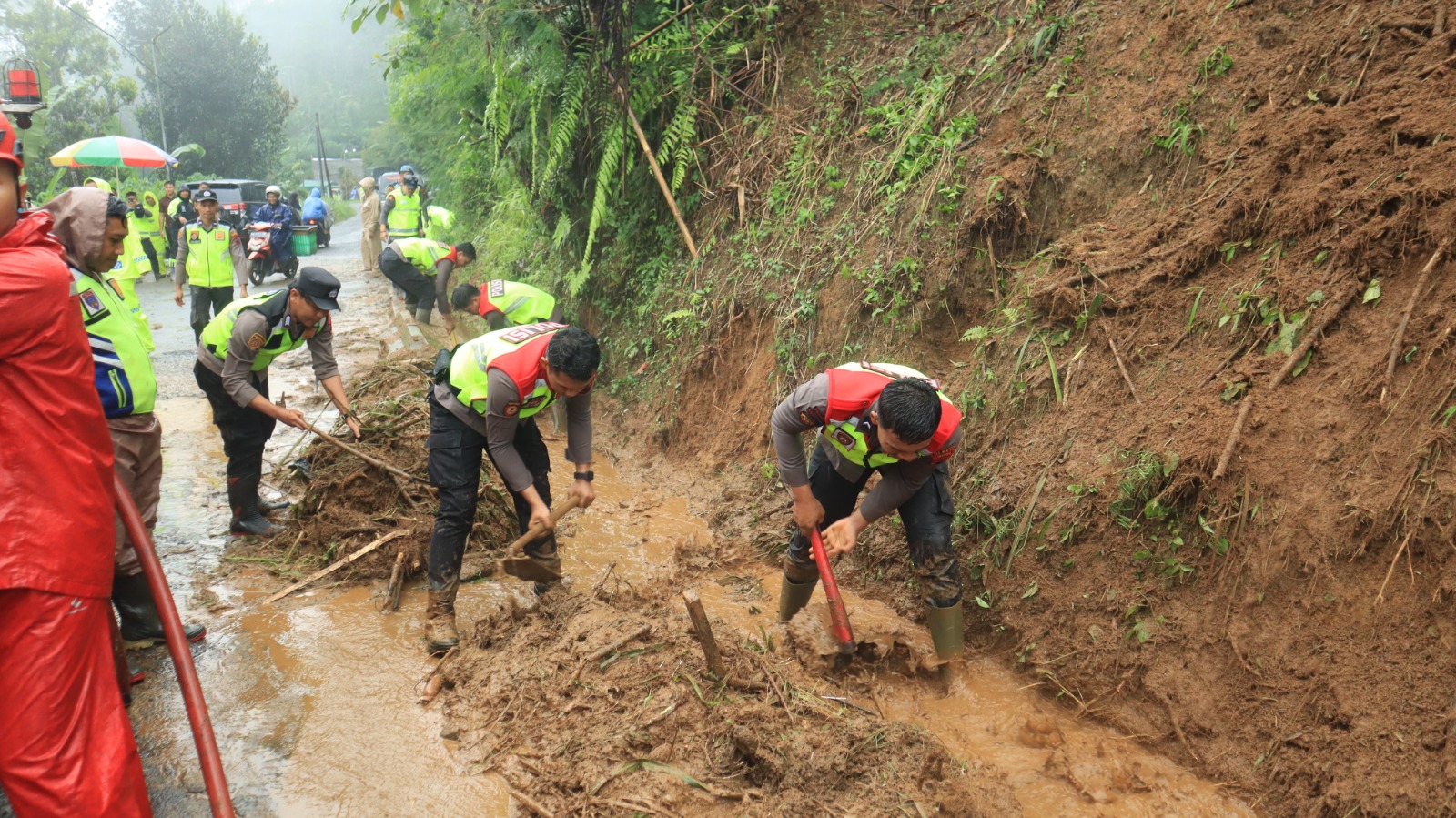 Menindaklanjuti informasi kejadian, Kapolres bersama personel Siaga Bencana Bhayangkara A, BPBD, dan masyarakat setempat segera melaksanakan pembersihan material longsor berupa tanah dan bebatuan yang menutupi badan jalan. Penanganan dilakukan secara bergotong royong agar jalur dapat kembali digunakan secepat mungkin.