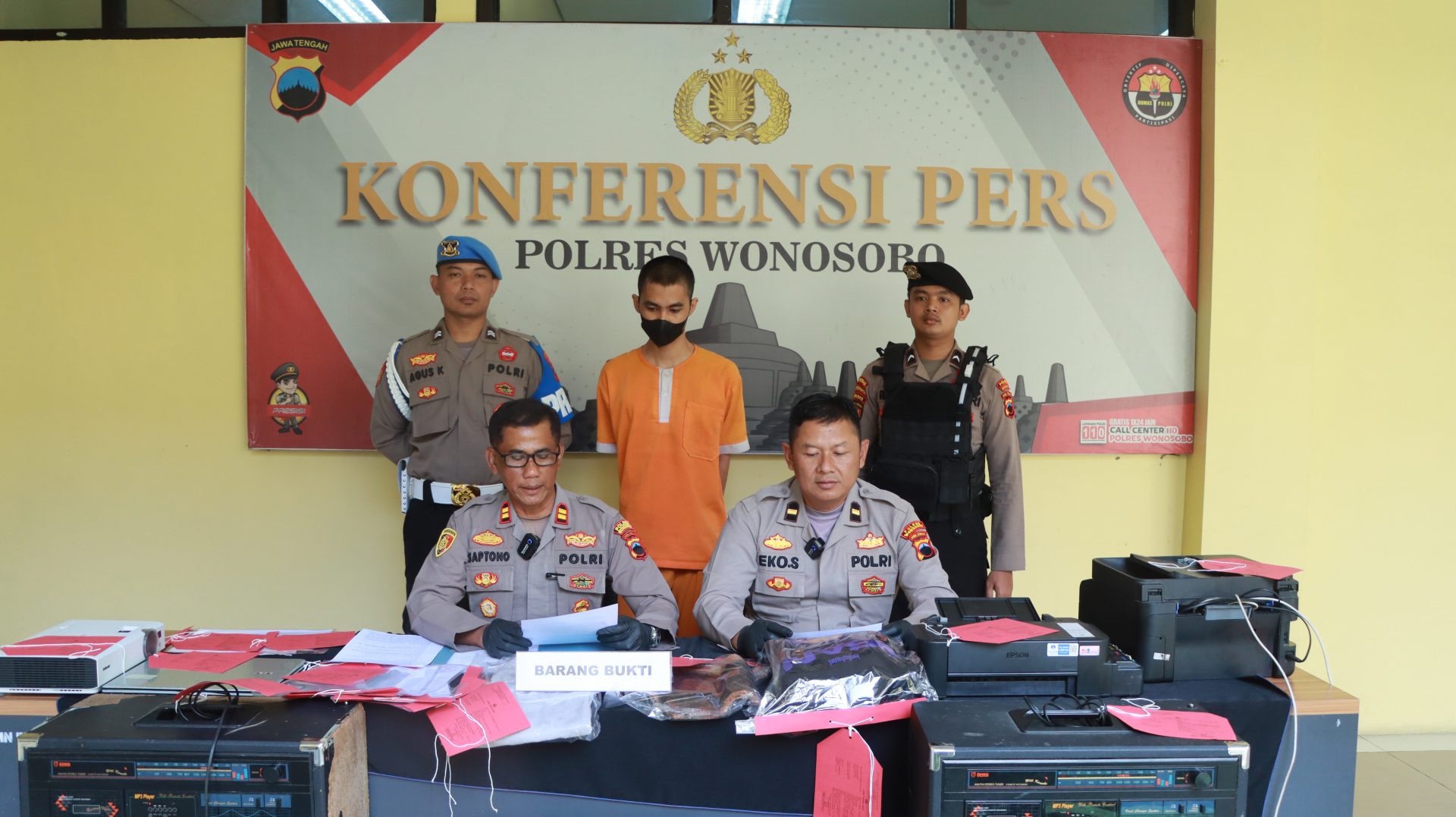Barang bukti yang berhasil diamankan antara lain satu unit laptop Acer, tape radio, proyektor Sony, tabung Bright Gas, serta beberapa barang elektronik lain yang sebelumnya dilaporkan hilang. Selain itu, turut diamankan flashdisk berisi rekaman CCTV, serpihan kaca jendela, balok kayu, hingga kendaraan pikap yang digunakan pelaku untuk mengangkut barang hasil curian.