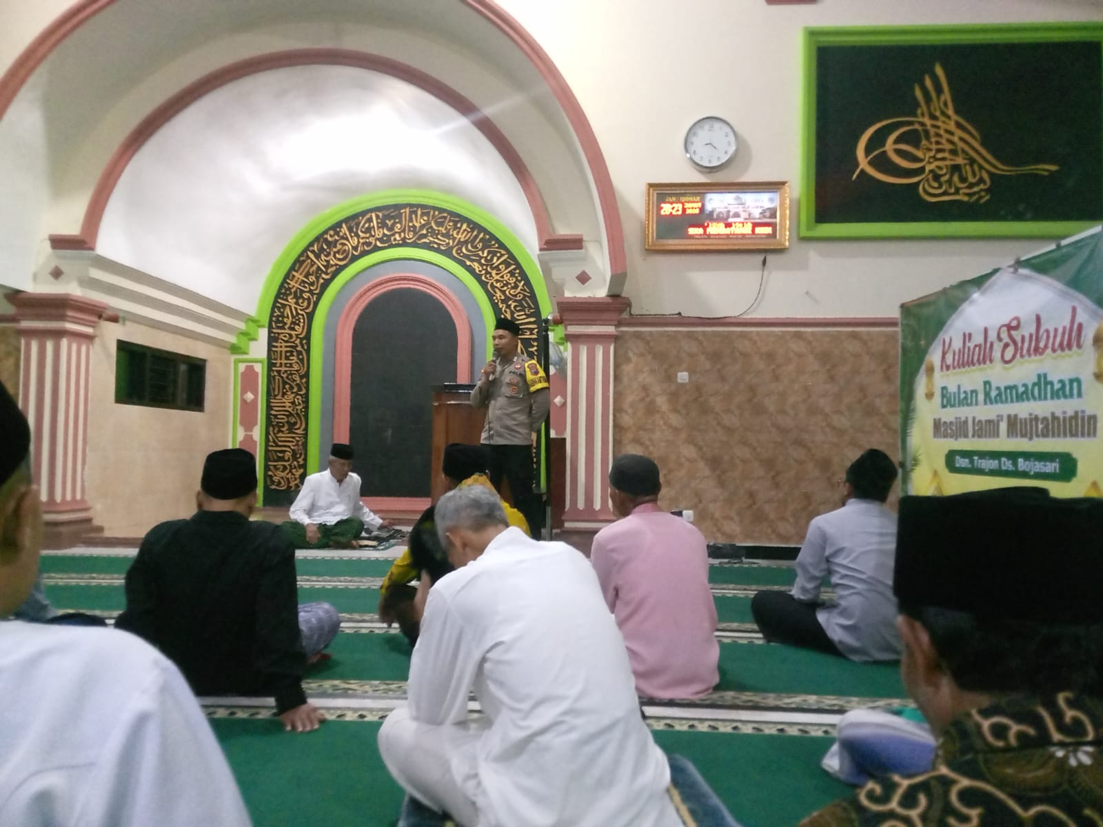 Bhabinkamtibmas desa binaan setempat, Bripka Indra S, turun langsung memimpin penyuluhan melalui metode sambang dan dialog warga. Pertemuan tersebut dimulai sekitar pukul 21.00 WIB hingga selesai di Masjid Jami Mustahidin Trajon.
