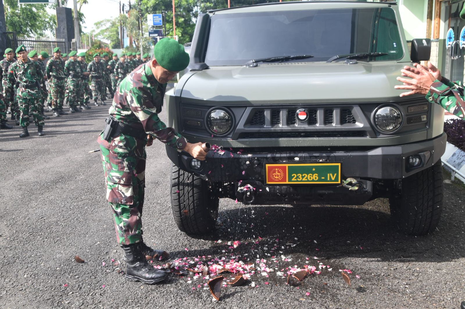 Ritual memecahkan kendi pada kendaraan baru memegang peran penting dan memiliki makna mendalam dalam tradisi budaya militer Indonesia, khususnya di lingkungan TNI AD. Pecahnya kendi tanah liat berfungsi sebagai pemecah pamor atau tolak bala guna mengusir kesialan dan hawa panas agar kendaraan tidak membawa malapetaka saat bertugas.