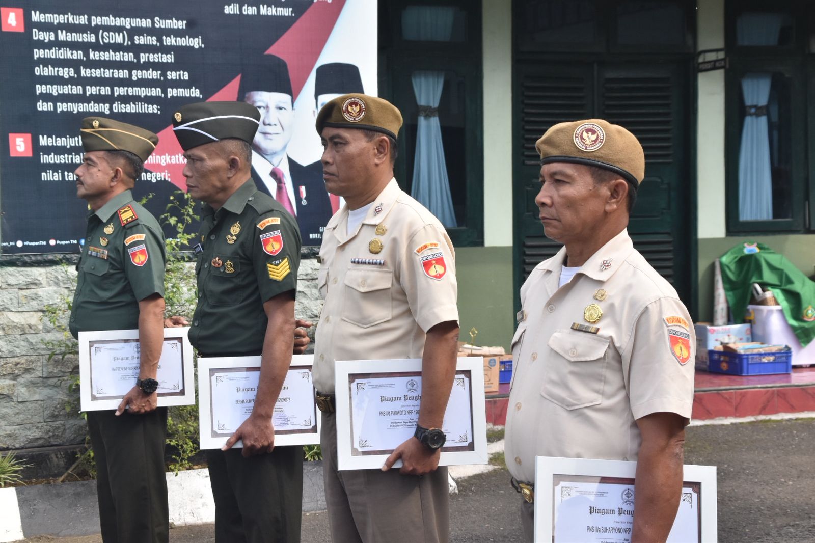 Keempat personil yang memasuki masa purna tugas tersebut adalah Kapten Inf Supriyanto (Danramil 04/Garung), Serma Suryantoro, PNS Purwoto, dan PNS Suharyono.