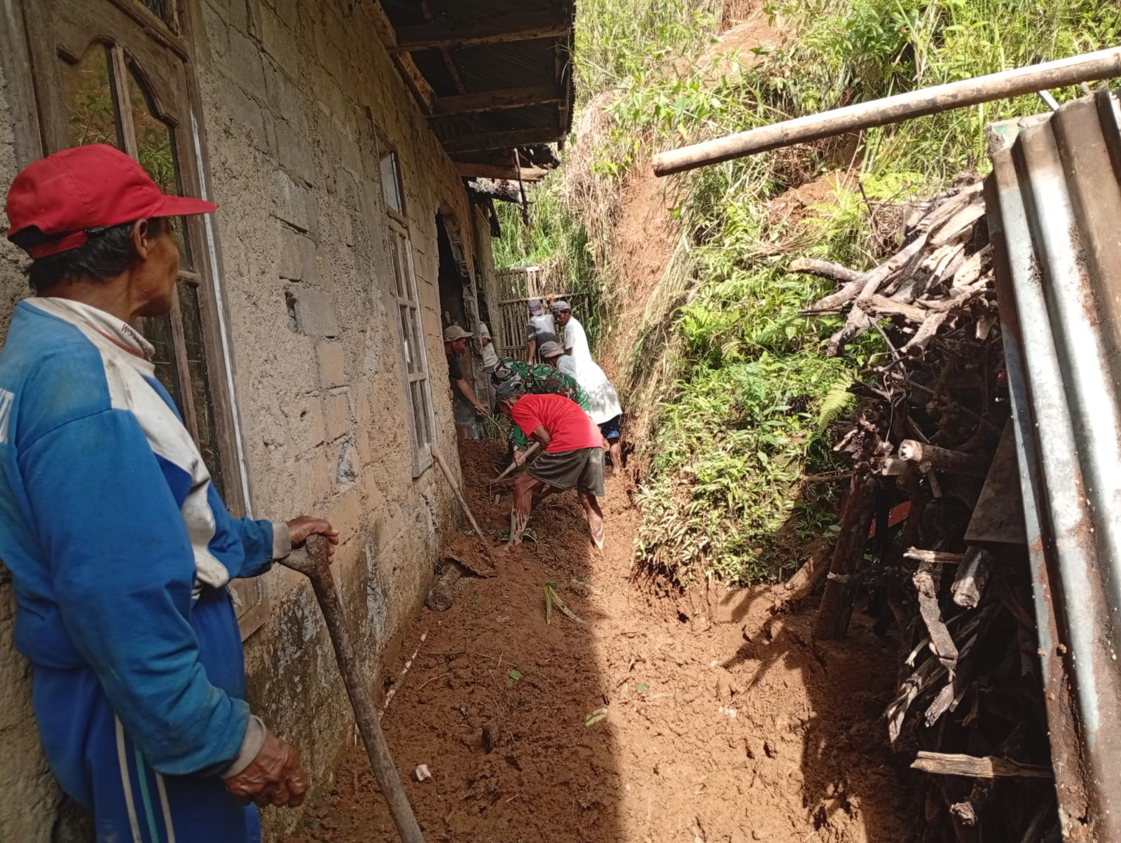 Melihat kondisi tersebut, Kapten Arm Suyitno segera mengerahkan personel Koramil 03/Mojotengah untuk turun ke lokasi dan melakukan karya bakti bersama warga setempat. Personel TNI bahu-membahu membersihkan tumpukan tanah dan batu yang menimpa rumah korban.