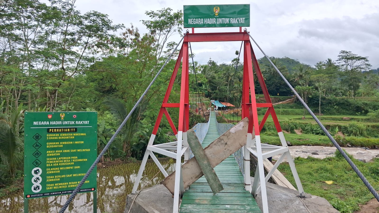 Wonosobo – Kodim 0707/Wonosobo berhasil menyelesaikan pembangunan Jembatan Gantung Garuda sepanjang 90 meter yang melintasi Sungai Begaluh. Jembatan ini menjadi penghubung vital antara Dusun Klilin, Desa Sindupaten, Kecamatan Kertek dengan Dusun Pagentan, Kelurahan Kalikajar, Kecamatan Kalikajar, sehingga memangkas jarak tempuh dan memudahkan aktivitas sehari-hari masyarakat setempat.
