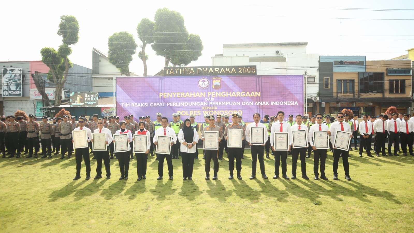 WONOSOBO — Personel Satuan Reserse Kriminal (Satreskrim) Polres Wonosobo menerima piagam penghargaan dari Tim Reaksi Cepat Perlindungan Perempuan dan Anak (TRC PPA) Nasional dalam upacara yang digelar di halaman Mapolres Wonosobo, Rabu (4/3/2026).
