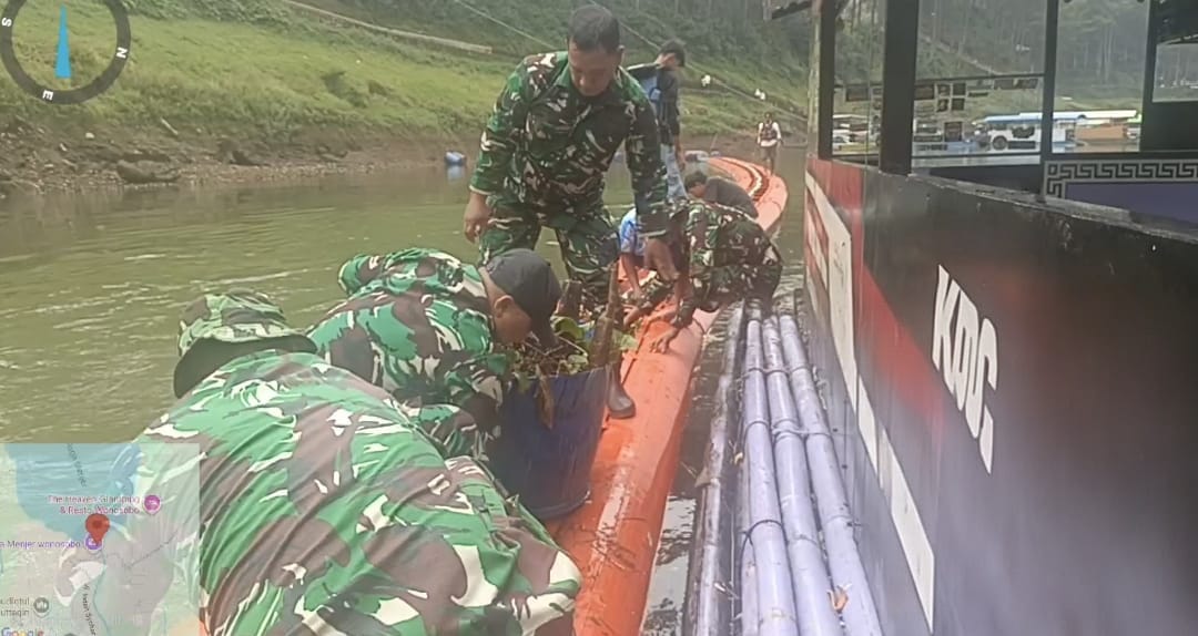 Kegiatan pembersihan berlangsung dengan penuh semangat gotong royong, diikuti puluhan personel Koramil, Polsek, anggota Karang Taruna, serta masyarakat sekitar Telaga Menjer.