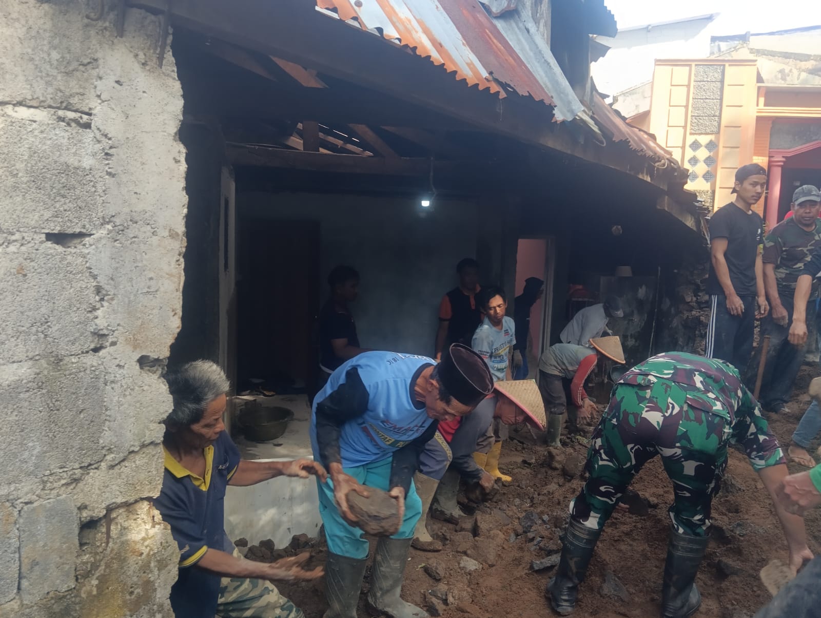 Upaya pembersihan oleh warga mendapat dukungan penuh dari personel Koramil 04/Garung Kodim 0707/Wonosobo. Para prajurit TNI tersebut langsung turun ke lokasi kejadian untuk bahu-membahu menyingkirkan material tanah dan sisa puing bangunan dari area rumah korban.