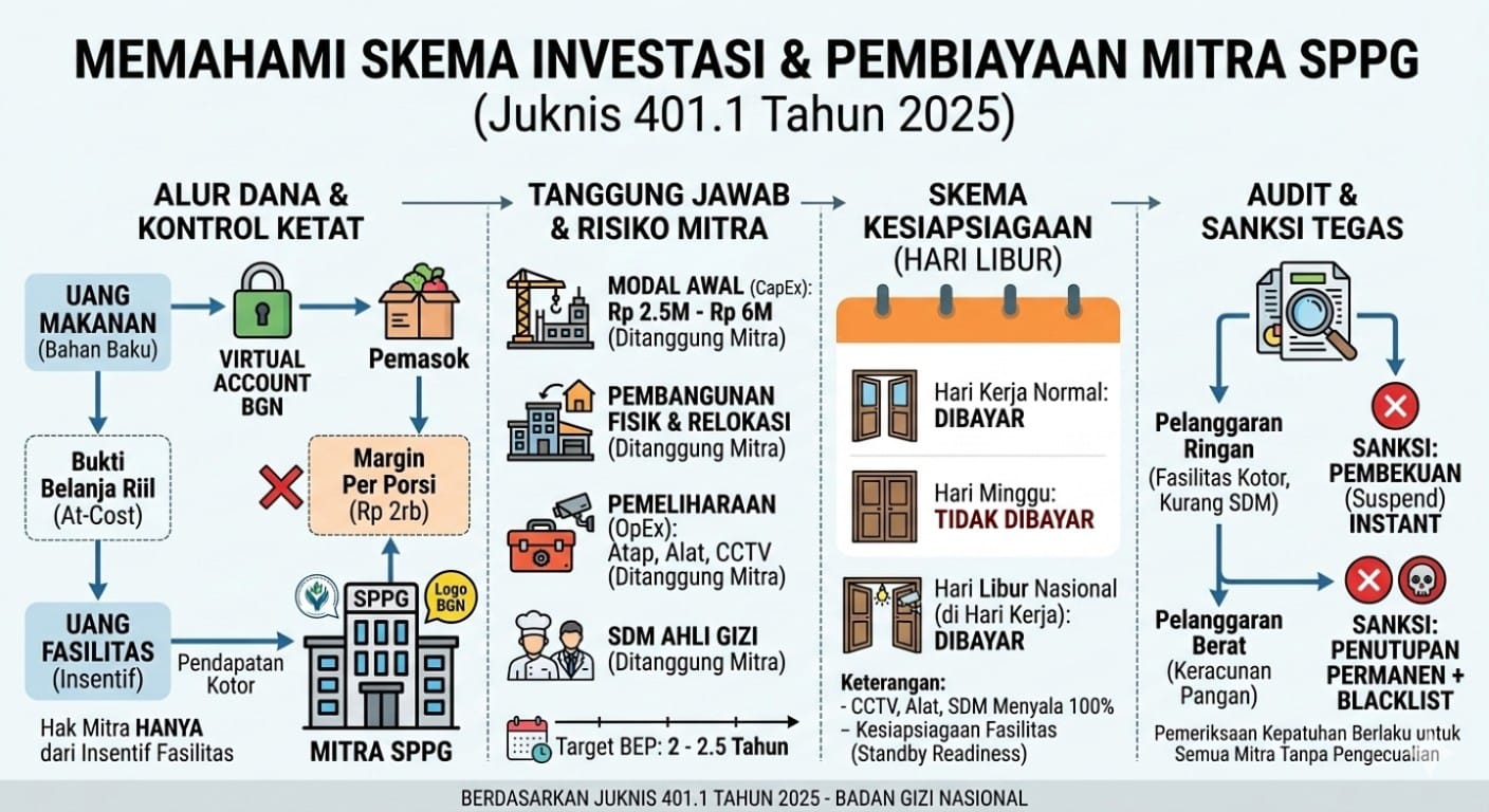 Risiko paling fatal bagi mitra adalah pemutusan kontrak dan pembekuan operasional. Kontrak kerja sama hanya berlaku satu tahun dan perpanjangannya murni ditentukan oleh BGN melalui audit kepatuhan kerja.