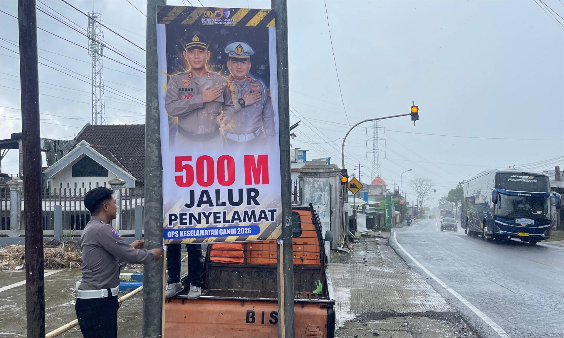 Wonosobo — Satuan Lalu Lintas Polres Wonosobo memasang banner imbauan keselamatan di jalur rawan kecelakaan lalu lintas Jalan Raya Parakan–Kertek, Kabupaten Wonosobo, Selasa (3/2/2026). Kegiatan ini dilakukan sekaligus untuk mensosialisasikan pelaksanaan Operasi Keselamatan Candi 2026 kepada masyarakat.