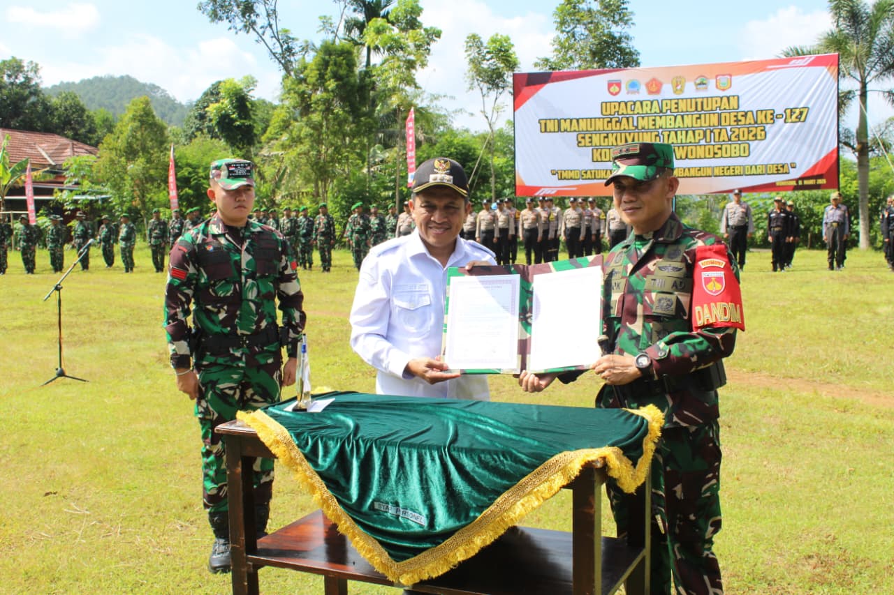Wonosobo – Kodim 0707/Wonosobo resmi menutup pelaksanaan Program TNI Manunggal Membangun Desa (TMMD) Sengkuyung Tahap I Tahun Anggaran 2026 di Desa Trimulyo, Kecamatan Wadaslintang, Kabupaten Wonosobo. Upacara penutupan berlangsung khidmat dengan Inspektur Upacara (Irup) Dandim 0707/Wonosobo Letkol Inf Yoyok Suyitno S. Sos, (11/3/2026)